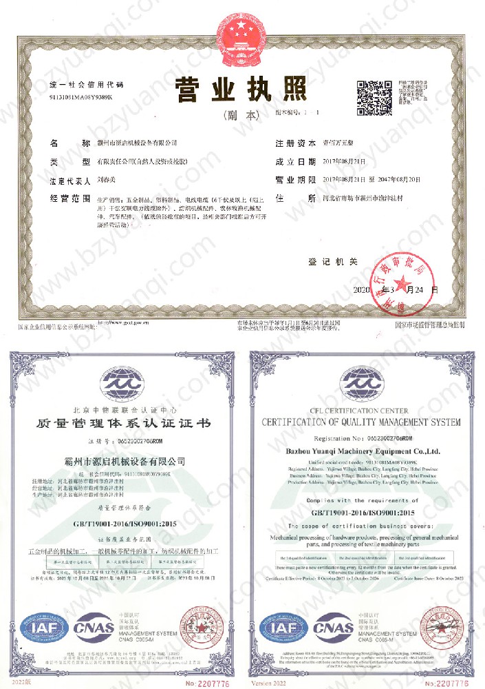 霸州市源啟機(jī)械設(shè)備有限公司秉承“誠(chéng)信、專(zhuān)業(yè)”的經(jīng)營(yíng)理念,堅(jiān)持用戶(hù)至上、竭盡所能、有始有終 客戶(hù)至上,細(xì)心呵護(hù)全程滿(mǎn)意。公司成立于2017年,公司地址在河北省廊坊市霸州市,公司主營(yíng)產(chǎn)品為生產(chǎn)銷(xiāo)售:五金制品、塑料制品、電線(xiàn)電纜(6千伏及以上(陸上用)干法交聯(lián)電力線(xiàn)纜除外)、紡織機(jī)械配件、農(nóng)林牧漁機(jī)械配件、汽車(chē)配件。(依法須經(jīng)批準(zhǔn)的項(xiàng)目,經(jīng)相關(guān)部門(mén)批準(zhǔn)后方可開(kāi)展經(jīng)營(yíng)活動(dòng)),集設(shè)計(jì)、研發(fā)、生產(chǎn)、銷(xiāo)售,為一體。堅(jiān)持“內(nèi)強(qiáng)素質(zhì)、外樹(shù)形象、質(zhì)量至上、規(guī)范發(fā)展”的治企方針,發(fā)楊“求真務(wù)實(shí)”的創(chuàng)業(yè)精神。目前公司已經(jīng)通過(guò)GB/T19001-2016/ISO9001:2015質(zhì)量體系認(rèn)證主要設(shè)備(見(jiàn)委外供方資質(zhì)···